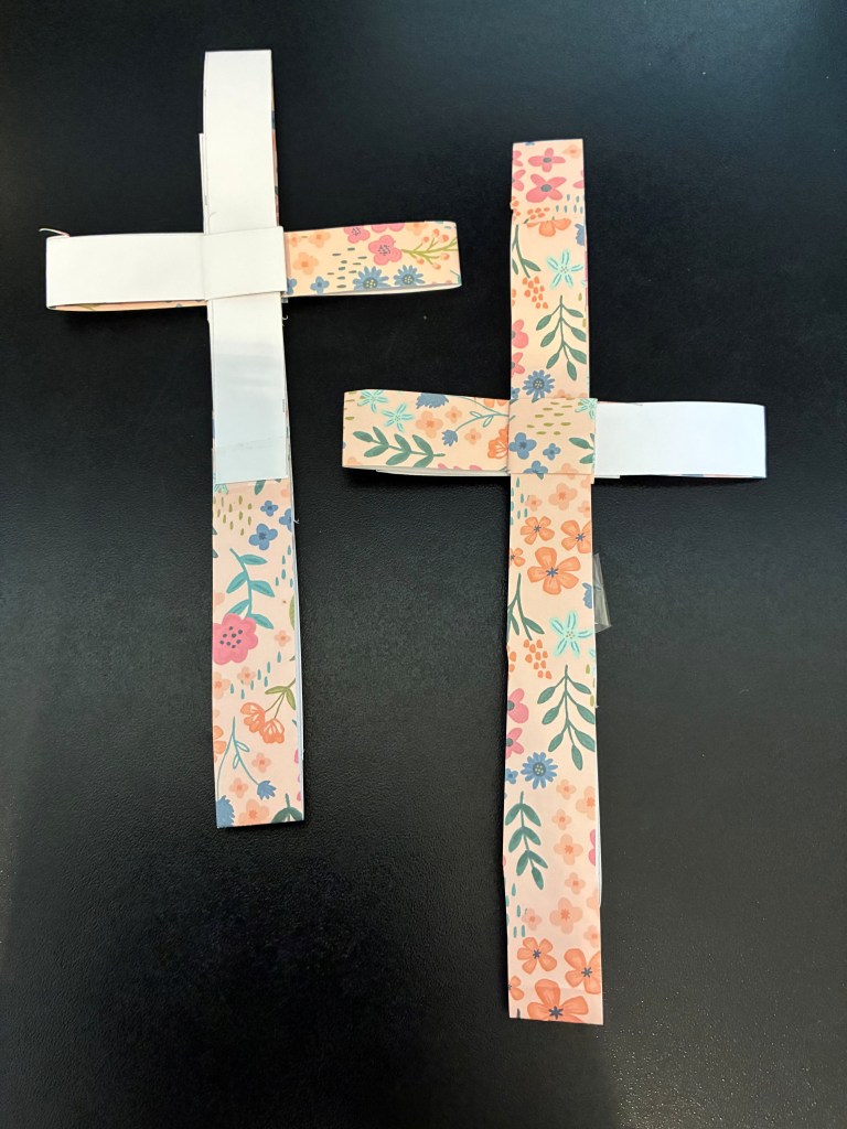 At a day of preparation for this week which to me is holy, we made paper crosses. We used paper which was white on one side and patterned on the other. The making involved folding, which meant we ended up with plain white bits clashing with patterns and flowers hanging upside down!